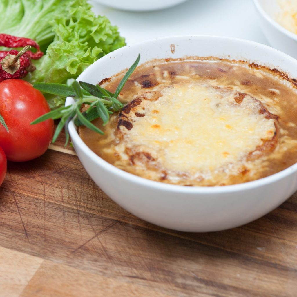 Ve Francii se vždycky všechno táhne. Na úřadech se to táhne, s námluvami dam se to táhne, a dokonce i tato cibulačka se táhne. Rozpuštěný sýr jí dodá jemnou oříškovou chuť. Přidej sýr!